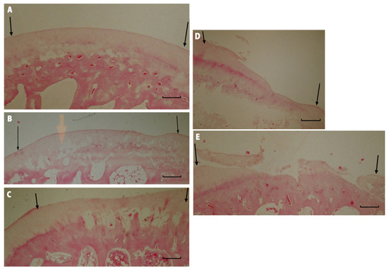 Microscopic imagines of histological samples of the cartilage of the studied groups. (A) Group I after 52 weeks of observation. The defect is bonded at both ends of graft (marked with arrows), the surface is smooth and intact, the thickness of the regenerated tissue is 100% that of normal cartilage, 50–99% of the subchondral bone is reconstructed. (B) Group II after 52 weeks of observation. The defect is well integrated, the surface is smooth, the thickness is 50–99% of normal cartilage, and more than 50% of the subchondral bone is reconstructed. (C) Group III after 52 weeks of observation. The surface of the regenerated tissue is smooth, the cartilage is well integrated, the thickness is 50–99% of normal cartilage, but less than 50% of subchondral bone is reconstructed. (D) Group IV after 52 weeks of observation. The surface of the defect is irregular, the margins of the defect are well integrated, the thickness is 50% of normal cartilage, and 100% of the subchondral bone is reconstructed. (E) Group V after 52 weeks of observation. The defect has disintegrated. Magnification x50.