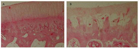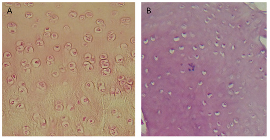 Decalcified material was embedded in Paraplast PLUS paraffin (Sigma Aldrich, Poznań, Poland). The blocks were cut in the frontal plane onto slides using a microtome, to a thickness of 4 µm. Paraffin sections were stained by the routine hematoxylin–eosin method. Samples from several areas of the regeneration were selected for microscopic evaluation. The reparative tissue was analyzed histologically. The cell morphology, regularity of surface, integrity of the structure, thickness, integration with surrounding cartilage, cellularity, and necrosis were studied by microscopic analysis on the basis of the O’Driscoll scale (Table 1) [55,56].