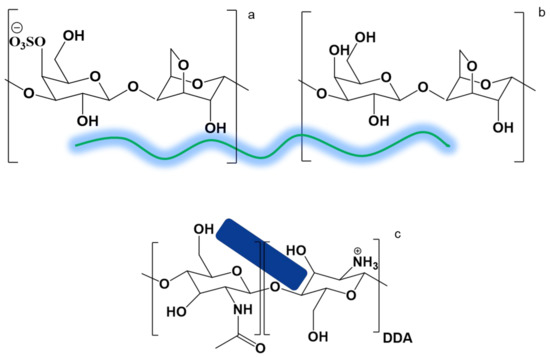One of the most common types of gelling CRGs is κ-CRG, whose structural unit is a disaccharide consisting of alternating O3-substituted β-D-galactopyranosyl and O4-substituted 3,6-anhydro-α-D-galactopyranosyl residues, with most D-galactose units containing a sulfate half-ester group at O4 (one sulfate group per disaccharide unit) (Figure 1a) [45]. Natural CRGs are often hybrids, such as κ/β-CRG [21,46,47]. Unlike κ-CRG, β-CRG does not contain the O4-sulfate group in the galactose subunit (Figure 1b) [48].