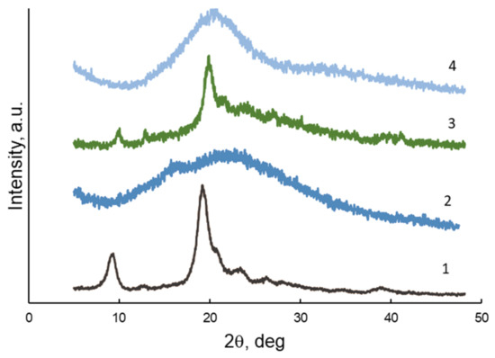 X-ray diffraction analysis of microparticles and hydrogels (Figure 2) also showed that CRG-CNW-MPs (3) retained the structure of the original CNWs (1) with specific but less pronounced reflections in the region of 2θ = 20° and 10°. However, their structure is more amorphous due to the presence of amorphous CRG (2). The structure of CRG-CNW-HGs (4) had a diffraction pattern different from that of CRG (2), with a more pronounced signal in the region of 2θ = 20°, indicating the contribution of CNWs to the structural organization of the hydrogel.