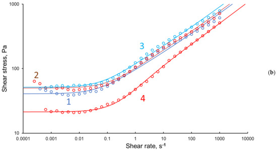 The Cox–Merz rule (dynamic viscosity is equal to shear viscosity when the values of angular frequency and shear rate are equal) did not hold for the tested samples, so we used only shear test data to analyze the rheological behavior. There is hysteresis when testing with decreasing and increasing strain rates, but it is not significant and only over a narrow range of strain rates, so it can be ignored. The graphs show only shear mode data with a decrease in shear rate.