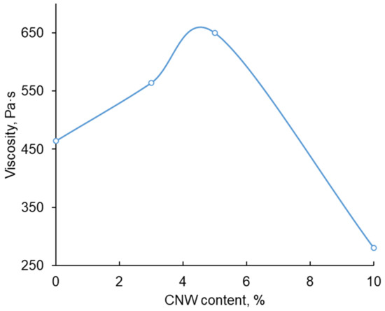 Viscosity as a function of CNW introduced at low shear rates (0.1 s−1).
