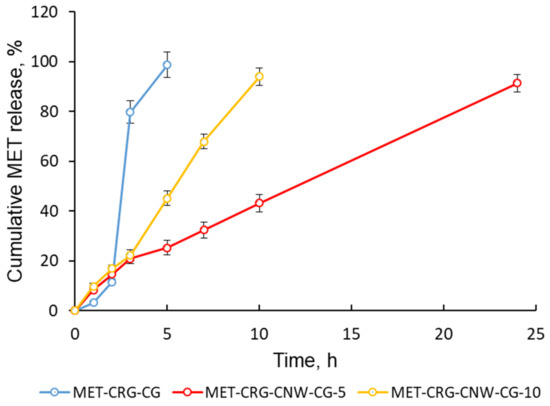 The study of MET release kinetics in vitro has shown that the rate and pattern of release depend on the amount of CNWs introduced, which determines the structure of the hydrogel/cryogel (Figure 7). In contrast to MET-CRG-CG, which showed a high rate of MET release within 5 h, cryogels containing 5% CNWs showed a sustained MET release within 24 h. However, the MET release profile of MET-CRG-CNW-CG-10 had a different nature. The amount of MET released was almost directly proportional to time, reaching a maximum in 10 h. This pattern of MET release is related to the structure of the obtained polymer systems. The introduction of 5% CNWs led to the formation of a composite hydrogel/cryogel reinforced with CNWs, but increasing the amount of CNWs to 10% contributed to the formation of a more dispersed (discrete) hydrogel/cryogel and correspondingly increased the rate of drug release. The different nature of drug release from cryogels with different CNW content is in excellent agreement with the rheological properties of the hydrogels and the morphology data of the resulting cryogels.