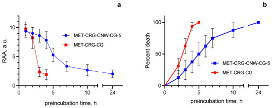 In addition, differences in the pharmacological activity of MET-CRG-CG and MET-CRG-CNW-5 were confirmed by analyzing the survival curves of T. vaginalis ATCC 50143 treated with cryogels preincubated in TYM (Figure 8b). That is, in contrast to MET-CRG-CG, which showed a high rate of MET release and, accordingly, a rapid loss of antiprotozoal activity within 5 h, MET-CRG-CNW-5, which had a sustained release of MET over 24 h, maintained a high level of residual antiprotozoal activity throughout the experiment.
