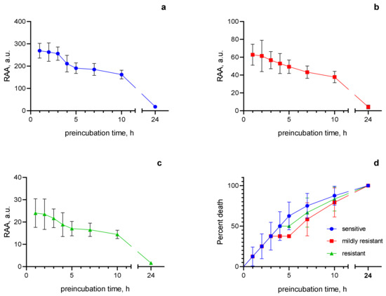 Residual antiprotozoal activity of MET-CRG-CNW-5 against sensitive (a), mildly resistant (b), MET-resistant (c) clinical isolates of T. vaginalis, and comparison of Trichomonas survival curves (d). For comparison of survival curves Log-rank (Mantel–Cox) test: χ2 = 0.4002; df = 2; p = 0.8187. Log-rank test for trend: χ2 = 0,1; df = 1; p = 0.7518. Gehan–Breslow–Wilcoxon test: χ2 = 0.2476; df = 2; p = 0.8836.