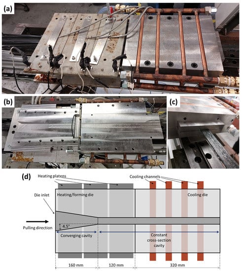 (a) Pultrusion setup while processing glass/polypropylene tapes; (b) view of the internal cavities of the dies; (c) obtained pultruded profile; (d) schematic of the heating/forming die and cooling die.