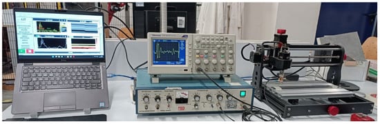 Five random zones of the pultruded composite, 50 mm × 15 mm in size, were analyzed by ultrasonic inspection. The ultrasonic equipment consisted of a high-voltage pulser-receiver (Olympus Panametrics NDT 5058 PR, Huston, TX, USA) connected with a piezoelectric probe (Karl Deutsch S 12 PB 1–7, Wuppertal, Germany) designed for the inspection of thin composites. The probe was positioned and moved across the composite surface by using a bench-scale CNC (Computerized Numerical Control) system (Mostics 3018 Pro). Finally, the return signal was collected by an oscilloscope (Tektronix TDS2000C, Beaverton, OR, USA). The full equipment was controlled by a LabVIEW code, which coordinated the ultrasonic generator and the CNC moving system, and analyzed the data acquired by the oscilloscope. In particular, the code acquires the reflection of impulsively emitted signals and analyzes the reflected spectrum of each acquisition point to define a scan of the observed window. The acquisition system is depicted in Figure 2.