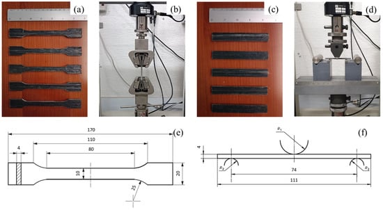 Samples (a), setup (b), and dimensions (e) for tensile testing; samples (c), setup (d), and dimensions (f) for three-point bending testing.