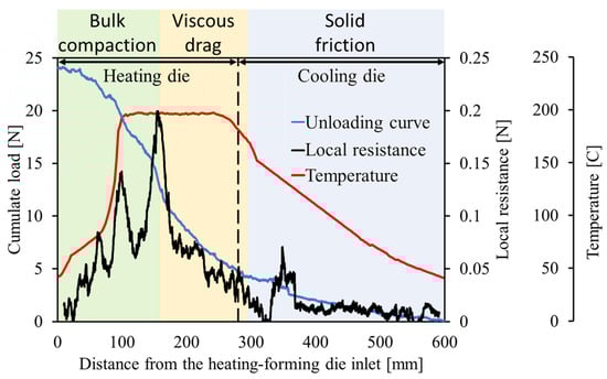 Afterward, the die has a straight cavity, where the viscous drag is the unique active force. The temperature remains constant up to 250 mm from the heating die inlet. After that point, the material starts cooling and continues throughout the cooling die. The temperature decreases and the matrix solidifies. A minor resistance peak was detected 350 mm from the inlet. Here, the thermal conditions cause the liquid–gel–solid transition, which increases the local viscosity of the matrix and determines an adhesive contact between the processed materials and the die walls. Within the final 250 mm of the cooling die, the unloading curve presents a linear decrease with a constant mild slope. Here, the interaction between the die and the compacted composite profile is based on the solid friction, which is remarkably lower than the force peaks observed in the converging region.