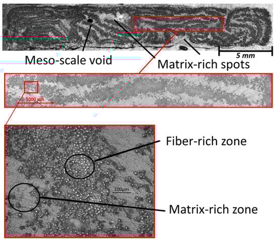 - The fibrous reinforcement is not uniformly distributed over the cross-section of the profile and appears grouped in the configuration of the pristine tapes. Optimization of the pulling speed and processing temperature can potentially improve the polymer flow and be beneficial for a better distribution of the reinforcement.