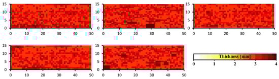 The results of the ultrasonic inspections performed on five random investigation windows of the pultruded profile are reported in Figure 6, which shows the C-scan graphs.
