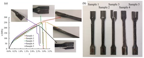The five samples exhibited linear behaviors with a tensile modulus of 22.5 ± 0.5 GPa for strain values lower than 0.25%. The ultimate load achieved by the samples is strictly related to the failure mode. Samples 3, 4, and 5 failed at the grip section due to the reinforcement discontinuity generated by the cutting operation, as is observable in Figure 7b, and may be not representative of the actual mechanical behavior of the composite material. Samples 1 and 2 exhibited higher tensile strength of 253 MPa and 258 MPa, respectively. In these cases, the prevalent failure mechanism observed was interlaminar sliding.