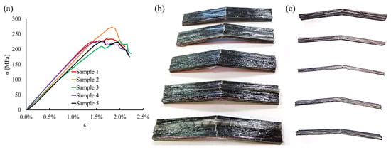 (a) Three-point bending stress–strain curves; top view (b) and side view (c) of the failed samples.