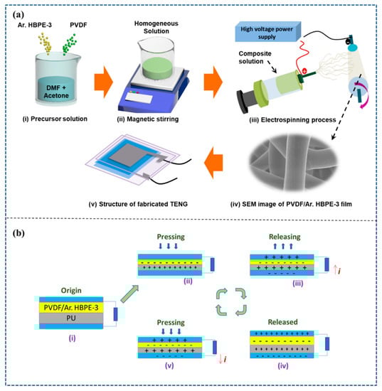 For the TENG fabrication, P-Ar.HBP-3 (10 to 40 wt.%) electrospun mat and non-woven polyurethane (PU) film were cut into the specified sizes (effective working area: 2 × 2 cm2). Across both sides of the mat, two Ni–Cu conductive electrodes were placed as the top and bottom electrodes. Electrodes were then soldered with Cu and finally, two flexible PET substrates of a larger size compared to the size of the fiber mat were fixed on both sides of the electrodes. To construct a compressed device and resolve the gap among materials, the layered structure was finally subjected to proper pressure. This was to prevent the triboelectric effect and to shield the nanogenerator from environmental damage. In addition, this will not allow direct contact of the sensor with the skin and is safe for the user performing the measurements. Figure S2 (see in Supplementary Materials) depicts the device’s optical view.
