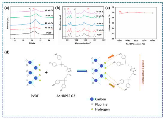 (a). XRD pattern and (b). FTIR spectra of PVDF fibers as well as P-Ar.HBP-3 (0 to 40 wt.%) blended nanofibers. (c). Computed β-phase content variability in P-Ar.HBP-3 (0 to 40 wt.%) blended nanofibers, and (d). Mechanism of β-phase formation in P-Ar.HBP-3 nanofiber.