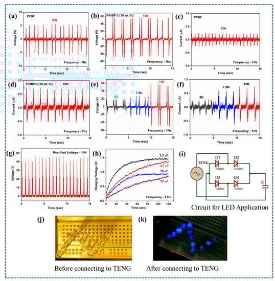 (a–d). Time-dependent VOC and ISC graphs of PVDF and P-Ar.HBP-3/PU (10 wt.%)-based TENG under constant frequency of 1 Hz and load of 10 N, respectively. (e,f). Output performances (VOC and ISC) of P/PU and P-Ar.HBP-3/PU (10 wt.%)-based TENG device as a function of load 5–10 N). (g). Rectified voltage of P-Ar.HBP-3/PU (10 wt.%)-based TENG (h). P-Ar.HBP-3/PU (10 wt.%)-based TENG device energy storage with various capacitors (2.2–22 μF) with charging cycles. (i). Circuit diagram for LED application. (j,k). Images of 12 LEDs before and after connecting P-Ar.HBP-3/PU (10 wt.%)-based TENG.