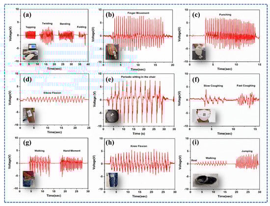 These results indicate that the TENG responds well enough to twisting compared to other activities as demonstrated in Video S2 (see in Supplementary Materials). When the sensor is employed as a finger ring with a bending inclination of 45°, it generated 13 V (Figure 5b). As shown in Figure 5c, once the sensor is punched, it exhibits a significant increase in voltage, i.e., 11.8 V. Similar results were seen for the elbow flexion sensed by the TENG’s detecting voltage of 2.5 V, as depicted in Figure 5d. Whenever the sensor is attached to the circular chair, and a person periodically sits on the chair, 16.5 V is displayed (Figure 5e). Additionally, if the sensor is affixed to the exterior of the mask to detect the pattern of coughing, this will vary its signal as depicted in Figure 5f which is 3.4 V and 4.9 V for slow and fast coughing, respectively. As illustrated in Figure 5g–i and in Supplementary Videos S3 and S4, the sensor can differentiate among various human activities including walking, leg movement, and jumping when it is positioned on the pocket, knee flexion and shoe sole. Video S3 (see in Supplementary Materials) shows the real-time measurement for the aforementioned pocket sensor.