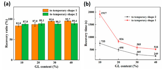 Characterization of the two shape recovery processes in a shape memory cycle. (a) The recovery ratio of the reversible shape memory polymers (RSMPs) under various GL ratios; (b) the recovery time of RSMPs under various GL ratios.