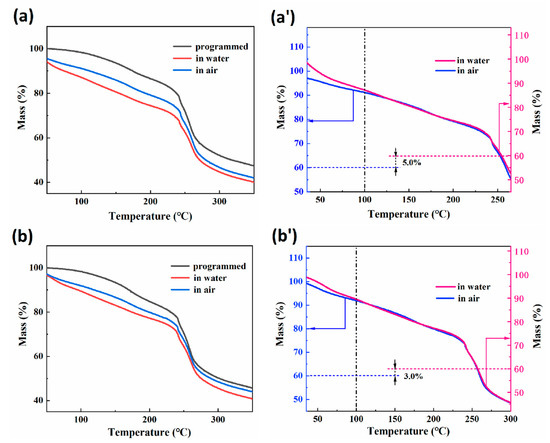 Thermogravimetric (TG) curves of RSMPs with a 30% GL ratio (named 30-RSMPs) at different stages of RSME (after shape programming and in the first shape memory cycle) are shown in Figure 4a. Figure 4a′ represents two curves from Figure 4a (in water and in air), with the TG curve in air having the intercept corresponding to 5% of water content subtracted. Figure 4b displays the TG curves of samples with a 40% GL ratio (named 40-RSMPs) at different RSME stages; Figure 4b′ is the curve obtained by adjusting the intercept of 3% water content between the two curves (in water and in air) shown in Figure 4b, respectively. It can be observed that the curves in Figure 4 follow the typical pattern of thermal degradation of natural polymers [45,46]. Most of the free water would be removed in the heating process (<100 °C), while the dehydration of combined water was a gradual process during the heating process. When the temperature reached 250 °C, the curve dropped sharply, indicating the significant thermal degradation of RSMPs. Comparing Figure 4a′,b′, it could be observed that after compensating for the difference in water content, the TG curves of the water-absorbed sample and the dehydrated sample (>100 °C) are almost identical, indicating that the water triggering the RSME of the composite films exists in the form of free water. Moreover, the difference in water content has no influence on the internal structure of the material. The change in crystallinity was usually accompanied by the change of thermal stability for natural polymer materials [47,48], and the parallelism of TG curves between two shapes indicated that the entry and exit of water did not affect the crystallization region of CS. It is evident that the water molecules lost by RSMPs between temporary shape one and temporary shape two did not bind with chitosan, but rather formed hydrogen-bonded chains to occupy the gaps in the chitosan chain segments, which mainly consisted of free water. In contrast, the TG curve of the thermally-programmed material did not exhibit such “parallelism” with the temporary shape one and temporary shape two curves. Therefore, it can be confirmed that the water molecules absorbed by the material during the transition from thermal programming to the shape memory period were linked with chitosan through hydrogen bonding, which is referred to as bound water.