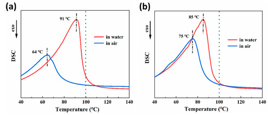 Figure 5a,b display the results of DSC tests conducted on 30-RSMPs and 40-RSMPs during the first shape memory cycle. The 30-RSMPs DSC curve exhibits a significant endothermic peak at 91 °C (in water) and 64 °C (in air), while the 40-RSMPs DSC curve exhibits similar peaks at 85 °C (in water) and 75 °C (in air). The peak difference for 40-RSMPs is only 10 °C, which is significantly less than 30-RSMPs’ 27 °C, thus confirming that the recovery time (to temporary shape one and to temporary shape two) for 40-RSMPs is faster than for 30-RSMPs. The shape recovery speed is regulated by the glycerol content in the film. With an increase in the glycerol content, the water absorption and water loss is fast, thus recovery speed of the film is increased. The absorption or loss water was in the form of free water; the results observed were consistent with the findings from the thermogravimetric (TG) analysis.