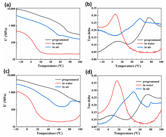 Dynamic mechanical analysis after shape programming and in the first shape memory cycle. (a) Storage modulus curves of 30-RSMPs; (b) tanδ curves of 30-RSMPs; (c) storage modulus curves of 40-RSMPs; and (d) tanδ curves of 40-RSMPs.
