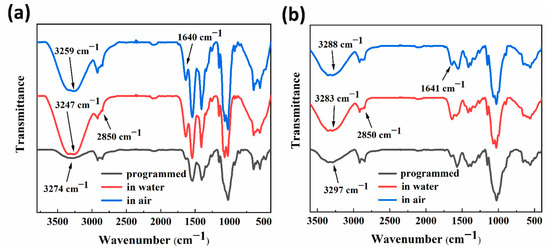 Figure 7a,b showed the FTIR test spectra of RSMPs at different stages of RSME (after shape programming and in the first shape memory cycle) with 30% and 40% GL ratio. According to the curve analysis in the two plots, for the programmed RSMPs, the two absorption peaks at 3274 cm−1 and 3297 cm−1 were assigned to the overlapping results of O−H and N−H stretching vibrations. In response to water stimulation, the overlapping peak moved in low wavenumbers to 3247 cm−1 and 3283 cm−1, respectively. Moreover, when the SMP responded in the air environment, the overlapping peaks moved again to the high wavenumber of 3259 cm−1 and 3288 cm−1 but were still lower than the programmed wavenumber. This was strong evidence for the formation of hydrogen bond-based supramolularly reversible cross linking inside RSMP networks. The absorption peak at 2850 cm−1 was assigned to the C−H of methylene at the carbon atom at position 6 (C6) and its intensity decreased delicately with the formation of hydrogen bonds between water and hydroxyl groups at C6. The elongation vibration peak of C=O corresponded to the RSMPs of 1640 cm−1 and 1641 cm−1 in two plots, with a significantly enhanced peak strength after increasing the water content, which was also associated with the base energy to form reversible hydrogen bonds with water molecules. Therefore, the process of hydrogen bond re-establishment and the swelling effects of solution molecules could be important sources of reproducibility and reversibility of RSME.