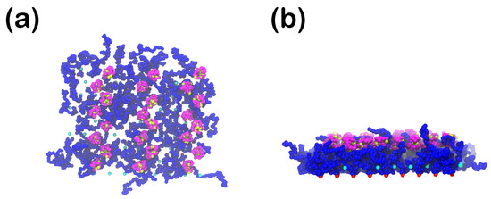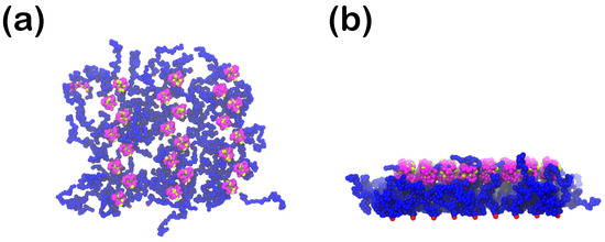 For the incorporation of ligands into the system we add extra CG beads to the expense of water beads (Figure 4e and Figure 5, where ligand A-beads are depicted with a light blue color), while the coating and the proteins remain unchanged. These extra beads are kept at a fixed position at throughout the simulation, where at we have the implicit wall that is attractive towards the proteins. The ligands have a uniform distribution in the x-y-plane with surface density (ligands per area) equal to (high density ligands) or (low density ligands). They interact with the hydrophilic part of the protein through either the weakly attractive LJ or the strongly attractive LJ, cf., Equation (2).