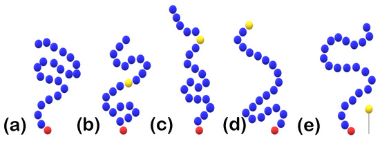 Schematic drawing. Placement of attractive (LJ) A-beads (yellow) considered in this study. For a tethered polymer chain (blue non-tethered, red tethered), we see (a) an un-doped chain, (b) A-beads at chain’s center, (c) A-beads at a random position, (d) A-beads at the terminal position, and (e) A-beads as ligands tethered at fixed altitude () over the surface.