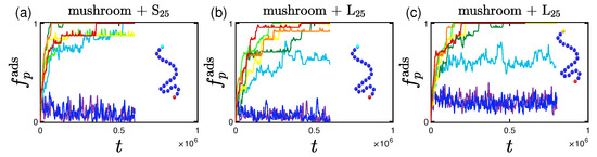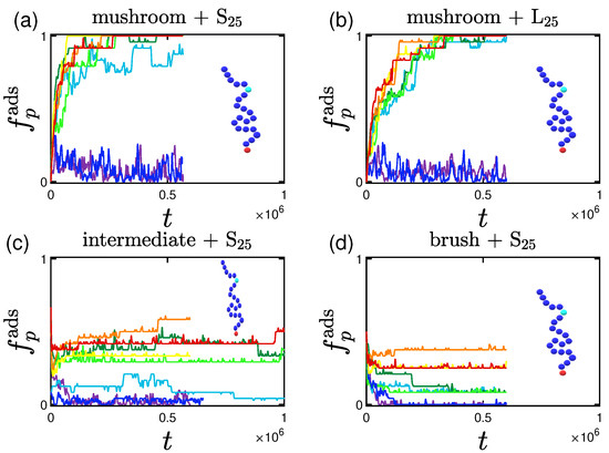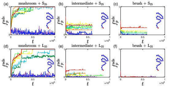 Qualitatively similar results were reported in the work of Yoshikawa et al. [101] for adsorption of Bovine Serum Albumin (BSA) proteins on poly(2-hydroxyethyl methacrylate) (PHEMA) brushes. Their adsorption curves are showcasing the effect of the grafting densities that we have in Figure 6. The average time for their experimental system to reach the final adsorption percentage is of the order of minutes. A BSA protein (which is slightly ellipsoidal [101]) is approximately of radius equal to nm and has a molecular weight of kDa [101]. Using these values, the LJ unit length is of the order of 1 nm, and the LJ unit mass is roughly 1 kDa. Because our adsorption times are in the range of LJ units, the LJ unit time can be estimated as s, which however gives rise to an unreasonably small LJ unit energy, small compared with . A direct one-to-one mapping of our model to protein adsorption is therefore not possible, while the molecular weight of the proteins and polymers used have a proportion that is again close to the experimental conditions [101].