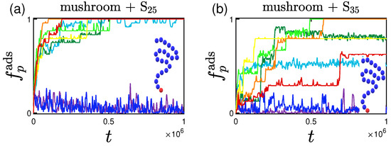 Concerning the amount or rate of adsorption we notice that there aren’t significant differences regarding the position of the attractive bead, just more intense fluctuations of the adsorption curve for the randomly placed A-bead. This can be due to the fact that there might be areas within the coating where there are no attractive beads at a specific height which leaves the coating with areas free from A-beads. Therefore whenever the excluded volume effect is strong enough, it leads to a tendency of the protein to reemerge at the top of the coating (as this would be more favorable energetically), since there are no neighboring attraction sites to keep the protein inside the coating. Some indicative plots of the percentage of adsorption for the randomly doped mushroom with A-beads of LJ interactions with the proteins can be found in Figure 8.