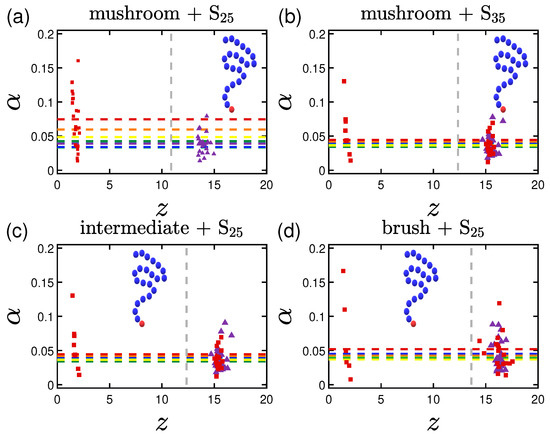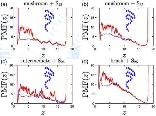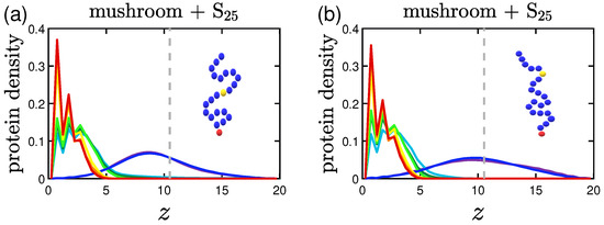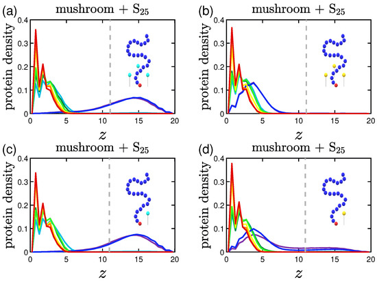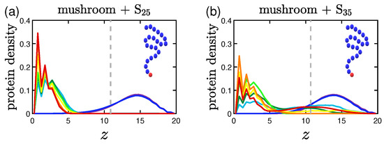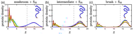 Keeping the same color code to depict the several effective attraction strengths I of the implicit wall, we plot in Figure 11 the density profiles for the mushroom, the intermediate and the brush coating, for the small protein system (S). The additional dashed gray line in the graphs stands for the respective averaged for . For wall attraction proteins tend to stay out of the coating (on the right of the dashed gray line), whilst away for the purely repulsive wall at . For , the highest peak of the curve is as close as possible to the attractive surface. This peak significantly decreases for the higher grafting densities due to excluded volume effects, for which we showed already that the amount of proteins adsorbed is low.