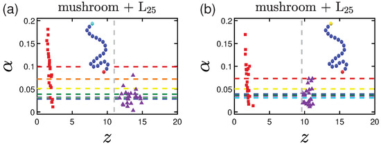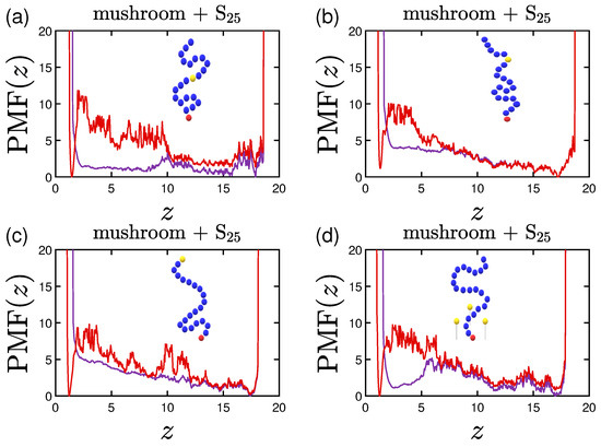 With a similar mindset as the one described in Section 2.1.3, we set the interactions of the free end of each polymer chain towards the hydrophilic part of the protein to be attractive, i.e., replace each terminal polymer R bead by an A-bead (Figure 4d). This attraction is once again given by Equation (2) for and , i.e., interaction potential LJ.