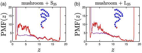 As far as it concerns the size of the protein, there are two cases studied. In the first case, each short (S) protein consists of a single chain of beads (25% or 35% of them are hydrophobic and the remaining ones hydrophilic) and in the second one, each long (L) protein consists of a single chain of beads (who are again 25% or 35% hydrophobic). These proteins are denoted as , and , , respectively. Since protein folding is mainly governed by the relative hydrophobic character of the amino acids, an attractive LJ interaction is set for the hydrophobic interactions following Equation (2), while all beads of the protein interact completely repulsively via the WCA potential with the rest of the beads that consist the system (i.e., the polymer coating, the water and the hydrophilic beads of the proteins). The bonds of the protein beads are given by Equation (3), having and as for the polymers.