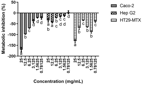 The results obtained regarding the CMC’s impact on the selected cells’ metabolic activity can be seen in Figure 1. As can be seen up to 25 mg/mL, no cytotoxic effects were observed in all tested cell lines. In fact, at higher CMC concentrations, metabolic promotions were observed, with particular emphasis being given to the high promotions registered for Caco-2 and HT29-MTX cells. When assessing the impact of the CMC concentration on the cell’s metabolism, it is possible to see that for Caco-2, a clear dose response is present for the highest concentrations tested, with a statistically significant (p < 0.05) effect being observed, while for the three lower concentrations tested, no clear effects were observed. For the other two cell lines, the results were more muddled, as, despite statistically significant differences (p < 0.05) being observed, no clear patterns of response could be ascertained.