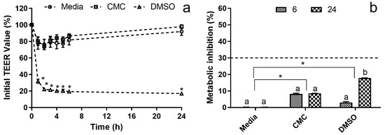 When one considers the impact of the studied conditions upon the Hep G2 cells present in the basolateral compartment (Figure 3b), it is interesting to see that none of the studied conditions led to reductions in metabolic activity above the 30% threshold, defined by the ISO 10993-5:2009 standard as the cytotoxicity limit [37]. In fact, even for DMSO, which registered a steep drop in membrane integrity in the TEER data, the 30% metabolism inhibition threshold was not reached after 24 h, with an inhibition value of 17.8 ± 0.1% being observed. When analyzing the DMSO metabolism inhibition data obtained for the 6 h and the 24 h timepoints and crossing it with the TEER data, it was observed that the metabolism inhibition increased with the duration of the assay while TEER data was relatively stable from 2 h onwards. This may indicate that while the DMSO rapidly compromises membrane integrity, it does not permeate the membrane at the same rate, instead slowly permeating towards the basolateral compartment, thus leading to the increase in cytotoxicity that was observed. On the other hand, when assessing the data obtained for CMC, it can be observed that no statistically significant (p > 0.05) differences were found between sampling times, with a Hep G2 metabolism inhibition of ca. 10% being registered. When considering that CMC did not, apparently, alter apical membrane integrity and permeability, this data may indicate that CMC’s presence on the apical side leads to the production of some metabolite or stress that results in the viability loss registered. This is particularly evident when one considers that while CMC presented a TEER profile similar to that of the media control, it presented statistically significant (p < 0.05) metabolism reductions relative to the control conditions.