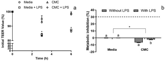 Interestingly, statistically significant (p < 0.05) differences were found between the controls and the conditions with CMC, as TEER values with lower variance were observed in the presence of CMC, even when the inflammatory stimulus was added to the system. These results are in line with those previously reported by Marescotti, Lo Sasso [40], which showed that LPS stimuli to the basolateral compartment of a Caco-2/HT29-MTX membrane did not cause any TEER decrease or increase in membrane permeation, with a possible explanation being a dysregulated LPS signaling through the down-regulation of the MD-2 and TLR4 receptors, as previously described by Abreu, Vora [41].
