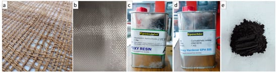 The manufacturing of composites in this study utilizes natural fibers and synthetic fibers. The natural fiber used is an agel fiber purchased at a craft shop in Yogyakarta. Glass fiber was expected to improve the properties of the composite. Figure 1 shows the fiber and matrix used in this study. The present study used two different fibers (agel and glass). The agel fibers are shown in Figure 1a, and the glass fiber used is a woven type with a weight of 200 gsm, shown in Figure 1b. The matrix that was used was Epoxy EPR 174, which consists of bisphenol A (see Figure 1c), while Epoxy Hardener EPH 555, which consists of cycloaliphatic amine (Figure 1d). For the filler materials, coconut shell-activated carbon filler with 1000 mesh sizes is used (Figure 1e).