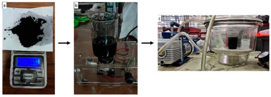 Preparation process. (a) Weighing filler, (b) stirring filler and matrix, and (c) degassing.