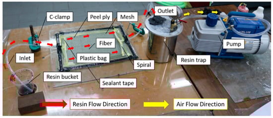 Experimental set-up of vacuum-assisted resin infusion. Red arrow for resin flow, and yellow arrow for air flow.