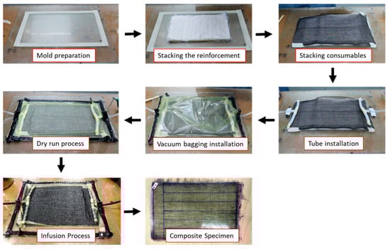 Vacuum-assisted resin infusion was used in the present study to manufacture hybrid composite laminates. This method has its challenges because the equipment preparation process is more complex than the hand lay-up method. More tools and materials make this method require a longer manufacturing preparation and higher costs. The resin contained in the plastic container is flowed into the mold cavity by the sucked of a vacuum pump. Before resin flow, the impression cavity containing agel fibers and glass fibers was ensured in a vacuum or without air. The vacuum condition in the mold cavity allows the resin to flow into the fiber without being blocked by air. This manufacturing method can produce composite materials that are better in strength because it can minimize the voids that often occur in other methods, such as hand lay-up. The experimental set-up and composite manufacturing process using the vacuum-assisted resin infusion method can be seen in Figure 3 where the resin flow direction are illuastrated in red arrow and the air flow direction are illustrated with yellow color. In the manufacturing process of the laminates, the detailed process can be seen in Figure 4. Fiber distribution in the composite specimen and the stacking sequence composite used in this study can be seen in Figure 5 and Figure 6.
