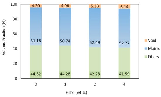 The fiber volume fraction, matrix, and percentage of voids contained in the specimen for each filler concentration are shown in Figure 8. The strength of the composite material depends on the number of fibers and the matrix content indicated by the volume fraction of the fiber and matrix. Voids can be a stress concentration in the composite. The presence of voids is one factor affecting the strength of the composite material. In this study, the presence of voids is obtained by calculating the difference between the theoretical and experimental density of the test object and then dividing it by the theoretical density.