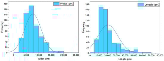 The size of the activated carbon filler used can be seen in Figure 10. The aspect ratio of the filler’s length (L) and diameter (D) affects the composite’s strength. The higher the aspect ratio (L/D) increases, the strength of the composite. The size of the activated carbon filler that has been observed has a width ranging from 1.4 µm to 25.1 µm, with an average width of 7.6 µm. Meanwhile, the filler length ranges from 3.8 µm to 76.4 µm, with an average length of 20.3 µm. A smaller filler size will result in a large filler surface area in contact with the resin. A wider surface area will increase the composite’s strength due to more efficient stress transfer.