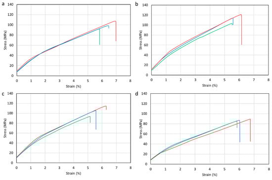 Stress–strain curve of (a) 0%, (b) 1%, (c) 2%, (d) 4% filler. Red line is sample 1, blue line is sample 2, and green line is sample 3.