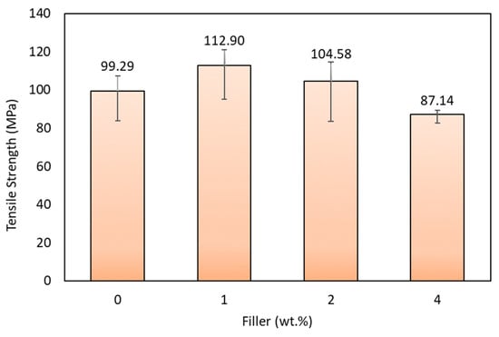 - The effect of adding filler on tensile strength shows that composites obtain the highest tensile strength by adding 1% filler, which is 112.90 MPa. Composites receive the lowest tensile strength by adding 4% filler, 87.14 MPa. Composites obtained the highest tensile modulus by adding 1% filler was 1.80 GPa, while the lowest was 1.30 GPa in composites with 4% filler;