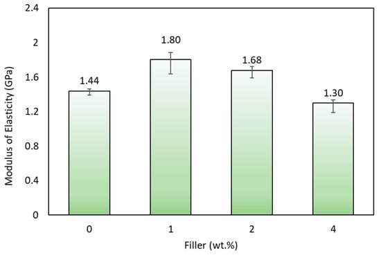 The uniform filler distribution in composite specimens with a filler concentration of 1% makes the load given during the testing process uniformly carried. The epoxy resin wets the fiber well, creating a strong adhesion between the fiber and the matrix. In contrast, the addition of 4% filler makes a non-uniform distribution of the filler. It is caused by the increase in the viscosity of the matrix as the filler concentration increases, which can reduce the flow rate of the matrix when wetting the fiber. The increase in tensile strength was followed by increased stiffness in the specimen. The results illustrated in Figure 13 shows that the tensile modulus with a filler content of 1% obtained the highest tensile modulus of elasticity, followed by specimens with 2% and 0% content. In composites with a filler content of 1%, there was an increase in tensile modulus of elasticity by 25% compared to composites without fillers. In comparison, specimens with a filler content of 4% have the lowest tensile modulus of elasticity. The previous results [63] showed that increasing the number of fillers will increase the strength and stiffness of the composite material.