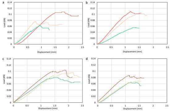 Load–displacement curve of (a) 0%, (b) 1%, (c) 2%, (d) 4% filler. Red is sample 1, green sample 2, and orange sample 3.