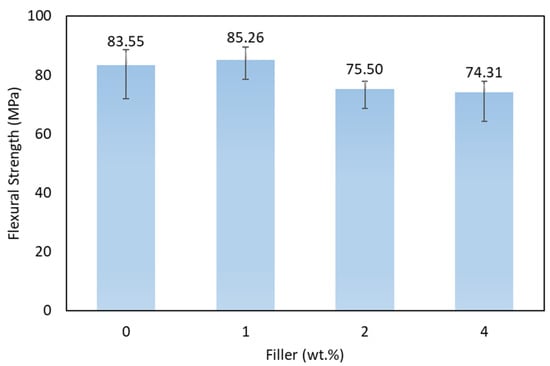 - The flexural test has revealed that the composite with 1% filler has the highest strength of 85.26 MPa, while the composite with 4% filler shows the lowest bending strength of 74.31 MPa;