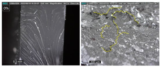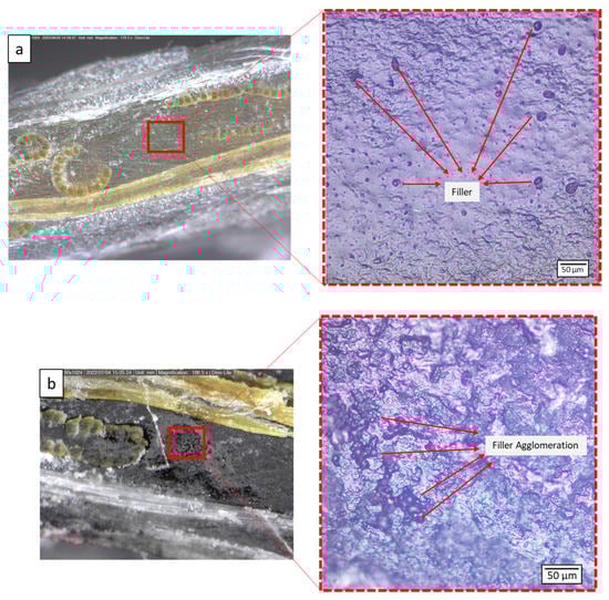 Micrograph analysis has been conducted on the failure specimen shown in Figure 16. The agglomeration phenomenon is due to filler agglomerate and creates a stress concentration around the edges. It can initiate cracks, as shown at 4% filler specimen. This confirms that adding the optimum amount of filler can increase the strength of the composite, but too much filler can create a weakness in the laminates due to agglomeration. The phenomenon of crack propagation that occurs after the tensile test can be seen in Figure 17. Fillers are capable of delaying crack initiation by crack propagation mechanisms such as deflection and blocking the crack bridging.