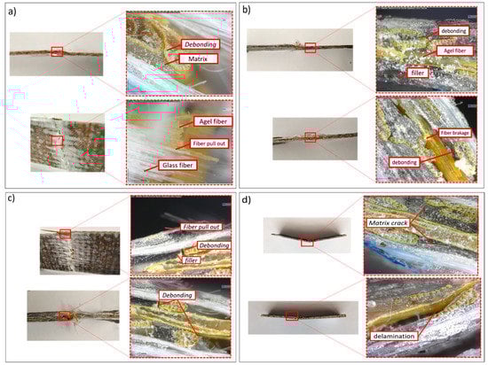 A hybrid composite consisting of glass and agel fiber with the addition of activated carbon filler was observed. Observations were performed to detect the failure phenomena, including fiber and resin interactions, fiber pull-outs, and other types of failure. Adding filler to the matrix will increase the laminate’s viscosity. Resin with low viscosity will interact easier with the fiber because of the high molecular mobility resulting in a strong bond [65]. In all variations, identical failure phenomena were found. Imperfection bonding between fiber and matrix resulted in debonding and delamination. The filler content in the matrix also affects the fiber-wetting process. Debonding and delamination failure indicates weak matrix adhesion to the fiber. These are due to agglomeration and unperfected fiber wetting by the matrix. Specimens observation showed optimal load transfer capability with a filler content of 1%. This is because the matrix, fiber, and filler can withstand the load optimally. Failure due to the crack matrix found in the specimen with a filler content of 4% indicates that the load transfer process is not optimal.
