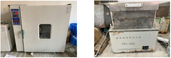 (3) According to the optimal mix ratio obtained by the orthogonal test, a cylindrical rice husk ash–rubber–fiber concrete test block with a diameter of 50 mm and a height of 100 mm was prepared. After grinding and drying, the dry–wet cycle test was carried out in different environments. The specimens were divided into six groups and placed in a constant temperature water bath at 20 °C, 60 °C and 80 °C, respectively. Two solutions were set for each temperature gradient, including water and a 5% NaCl solution. In order to accurately investigate the influence of hygrothermal environment on the fatigue performance of RC, the dry–wet cycle test (soaking 16 h + drying 6 h + cooling 2 h) was used to simulate the hygrothermal environment under laboratory conditions. The number of dry–wet cycles was 0, 7, 14, 28 and 56, respectively. The dry–wet cycle test process is shown in